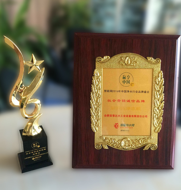 2016年11月25日,“贏享中國”2016年中國凈水產業生態大會暨品牌盛會頒獎盛典于北京釣魚臺國賓館隆重召開,合肥榮事達水工業設備有限責任公司榮獲品牌盛會2016“社會責任誠信品牌”獎。