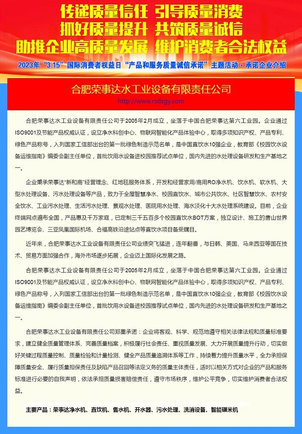 榮事達水工業(yè)公司將繼續(xù)做好產品和服務,以質量和口碑促進品牌魅力的持續(xù)提升,為更多消費者健康飲水提供優(yōu)質服務。