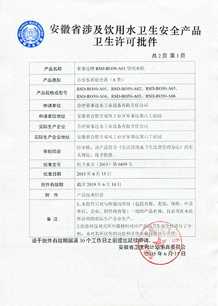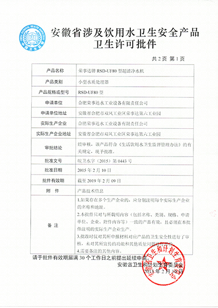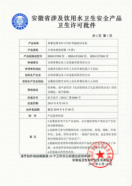 RSD-UF80型超濾凈水機衛(wèi)生許... -