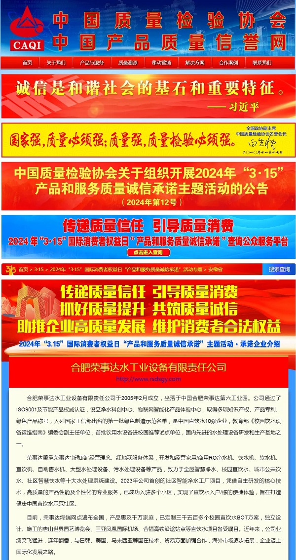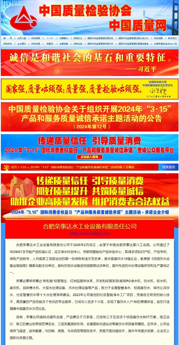 - 熱烈祝賀榮事達在2024年全國“3·15”活動中斬獲“全國凈水行業質量領先品牌”、“全國產品和服務質量誠信示范企業”等七項殊榮