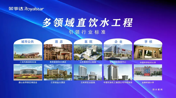 03 榮事達(dá)多領(lǐng)域直飲水工程 榮事達(dá)水工業(yè)公司作為凈水領(lǐng)域的佼佼者,已經(jīng)擁有二十年的行業(yè)積累。其產(chǎn)品覆蓋有千萬家庭、2000+企事業(yè)單位、3500+校園等場所。此外,榮事達(dá)水工業(yè)公司還獨(dú)立設(shè)計(jì)施工大型直飲水工程,包括秦始皇兵馬俑博物館、唐山世界園藝博覽會(huì)、三亞鳳凰國際機(jī)場、合福高鐵沿途站點(diǎn)等知名項(xiàng)目,以及埃塞俄比亞總統(tǒng)府、馬來西亞巴生港、贊比亞恩多拉機(jī)場、巴基斯坦默蒂亞里等海外項(xiàng)目,贏得了廣泛的贊譽(yù)和信賴。
